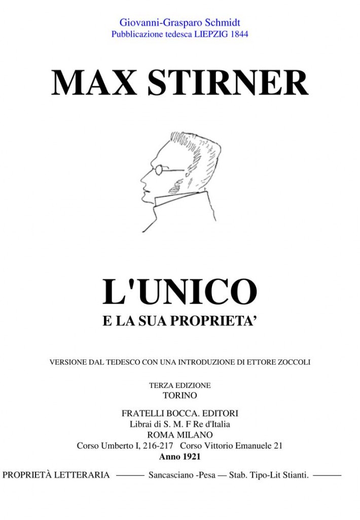 Giovannin Grasparo Schmidt. Pubblicazione tedesca LIEPZIG 1844. MAX STIRNER – (Johan Kaspar Schmidt). VERSIONE DAL TEDESCO CON UNA INTRODUZIONE DI