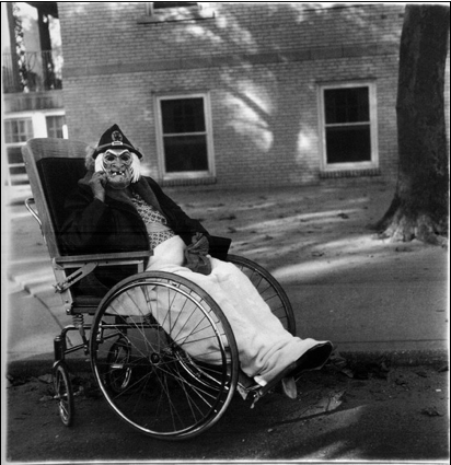Quattro. In A woman in a bird mask, N.Y.C., 1967, Diane Arbus disvela il cattivo gusto di una classe, quella al potere. Lo fa semplicemente fotografando una donna in maschera dell’alta borghesia americana, in preda ai furori di una gioventù perduta. L’immagine è impietosa. La fotocamera sembra profanare l’intimità della signora e l’ironia tra il vezzo occasionale e la struccatura fotografica è fortemente sottolineata. Per Diane Arbus il potere è male. Il potere è come una puttana senza clienti… fa un pompino a tutti in cambio di una speranza: quella che nessuno si accorga della vita miserabile che ha condotto per un po’ di soldi e sorrisi artificiali. Il potere è il gazebo dell’ovvio e dell’ottuso che si adegua alla convivenza di persone aride, capaci all’infinito d’imbecillità delle quali si sono fatti amministratori pubblici.