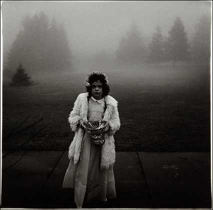 Sei. Nessuno mai è riuscito a fotografare la bellezza fatata o l’estraneazione dionisiaca dell’infanzia come Diane Arbus. Nemmeno Lewis Carroll, forse. Basta andare a leggere l’immagine Petal pink for little parties, white-over-pale form parties, 1962, per comprendere tutto il dolore che il cuore di un bambino può contenere e allo stesso tempo mostrare anche tutta la caratterialità di una stagione dell’uomo, della donna, troppo presto dimenticata. Diane Arbus fotografa la bambina come un fiore tra i fiori ma è per lo spettacolo della festa che è stata mascherata da fiore e il viso non è proprio quello di un angelo, semmai esprime una tensione interiore che denota una falsa sicurezza e, più ancora, la grinza della bocca lascia trasparire un’adultità già sedimentata e restituita all’urgenza della domesticazione sociale.