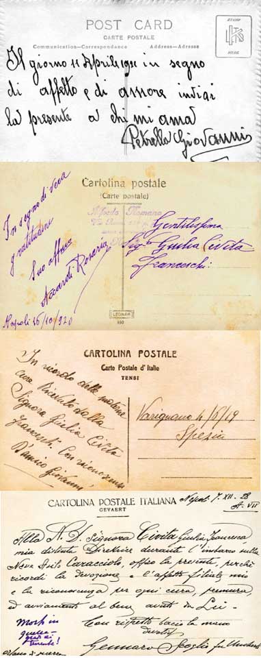 “Io stavo seduto alla punta della ferrovia vide arrivare una famiglia di forestieri che parlavano fra di loro, chiamarono dei facchini, allora rispose io brave gente mi fate il faore di chiamarmi a me in vece di chiamare i facchini perché io ho più fame gli altri perché nessuno mi vuole allora dissero i forestieri fai due o tre capovolte io le feci e mi dietero due lire poi dissero tutti siete porci voi napoletani io rispose voi vene abbusate che io non ho mezi di vivere altrimenti io fossi meglio di voialtri ma perora io non sono porco ma siete voialtri che prima ci fate fare le capovolte e poi ci chiamate porci ma ricordatevi che io sono buono di farmi voler bene da tutti. Voi che siete signori io mi levo il berretto ma per indeligeza son meglio di voi avete capito? Scusatemi gentilissima signora Civita io ringrazio tutti i superiori che mi hanno portato a questo stato ma io son piccolino e all’evolte fo delle piccole manganze ma però il signor Comandante mi rimprovera per farmi venire su buono. La cara signora Civita che se ne affliggi di me e tanto se ne cura da che io ero analfabeta ora scrivo da per me solo senza che nessuno mi díce níente e io lo devo tutto a lei che mi aiuta o come mia vera madre. La sera quando vado in branda penso quando i forestieri mi facevano fare le capriole ma io adesso vorrei vedere quel forestiere che mi chiamava porco in vece adesso vade vestito meglio di loro da marinaio Italiano e oppure un paio di scarpe nnere. Io ringrazio pure il reverente Viggiani che mi ha fatto venire. Se pure mi mandano in guerra io muoio col nome della mia cara signora Civita e col nome della patria e viva l’Italia”.