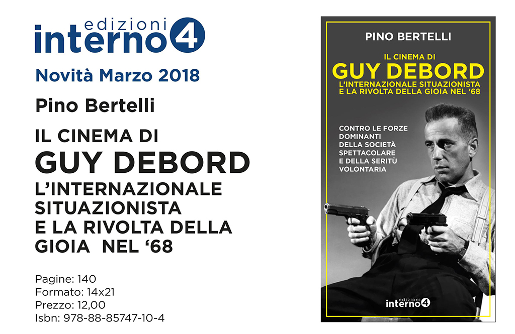 Il saggio di Pino Bertelli sul cinema sovversivo di Guy Debord, l’Internazionale Situazionista, la rivolta della gioia delle giovani generazioni nel Maggio ’68 e commentari sulla resistenza e insubordinazione al tempo del capitalismo parassitario è un pamphlet insolente, velenoso, anarchico che ripercorre cinquant’anni di storia (non solo italiana) fuori dalle dossologie sociologiche e dalle euforie politiche … è una requisitoria contro le forze dominanti della società spettacolare e della servitù volontaria che sostiene la perpetrazione di genocidi, terrorismi, colonizzazioni da parte dei governi forti, e permette ai ricchi di diventare più feroci e ricchi e ai poveri di essere più vessati e impoveriti.