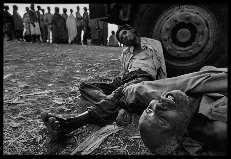 Le fotografie di Nachtwey, anche quelle più strazianti, mantengono quella necessaria distan- za etica o il rispetto del dolore che non toglie mai la dignità alla persona colpita dalla guerra o dall’evento (anche in rivolta) nel quale si trova coinvolta… il volto di un uomo sfigurato dai tagli della tortura (forse), le ossa della schiena di un uomo morente per fame, i bambini uccisi su un camion che li scarica in una fossa comune (una mano taglia l’immagine e fa cenno all’autista dove posizionare meglio il camion), la donna araba di nero velata che piange sulla tomba di un suo familiare, la donna araba di bianco velata che attraversa le rovine di una città, l’uomo ridotto a uno scheletro per la fame e la sete e quasi morente che riceve un foglietto da qualcuno ben vestito (si vede una mano, la giacca, la camicia e l’orologio)… e ancora guerre, e ancora vittime, e ancora proclami politici, e ancora religioni, e ancora terrorismi, e ancora borse internazionali e dividendi che si alzano insieme al numero di olocausti… la grande fotografia, come quella di Nachtwey, che si occupi dell’Irlanda, India, Africa, Somalia, Sudan, Rwanda, Sudafrica, Russia, Bosnia, Cecenia, Kosovo, Romania, Brasile o Stati Uniti è sempre quella che contiene l’attentato alle apparenze, il disdegno del pregiudizio o, più ancora, la critica radicale di una società spietata con i più deboli e tollerante e servizievole con i potenti.