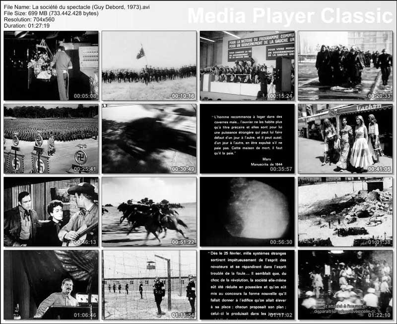 Note: La società dello spettacolo: scritto e diretto da Guy E. Debord. Montaggio, Martin Barraque. Assistenti registi, Jean Jacques Raspaud e Gianfranco Sanguinetti. Musica, Michel Corrette. Voce italiana, Christian Jaime. Détournement dei film di John Ford (Rio Bravo), Nichoals Ray (Johnny Guitar), Joseph von Sternberg (I misteri di Shanghai), Orson Welles (Arkadin), Sam Wood (Per chi suona la campana), Raoul Walsh (La carica fantastica) e diversi altri frammenti di film dei Paesi socialisti. 90 minuti. Bianco & nero. La voce originale (in sottofondo) dell’edizione in lingua francese è di Guy-E. Debord. Il testo della versione francese è ripreso dalla prima edizione de La Société du spettacle (1967). Una delle versioni italiane in videocassetta è uscita a cura di Nautilus nel 1996 e il testo utilizzato per questa traduzione (Paolo Salvadori) segue quello che si trova in “Opere cinematografiche” di Guy Debord, Arcana 1980.
