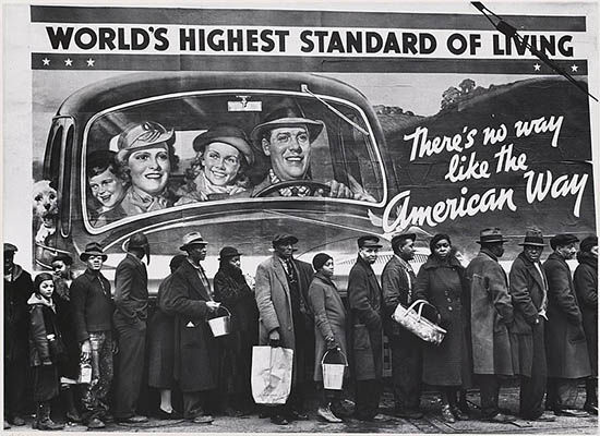 La bellezza poetica della Bourke-White non lascia spazio a rivisitazioni critiche né a giudizi estetici poco approfonditi — “la sua autorità di fotografa e autrice di sé si fonda su un patto, inteso come luogo dell’equilibrio tra il detto e il non detto, tra il mostrato e il non mostrato” (dicono le curatrici del suo libro, Il mio ritratto)17 —. Alla maniera di Robert Capa, Walker Evans o Robert Frank (nel fulgore delle loro differenze), la Bourke-White lavora su un’iconografia che sborda dalla foto-documentazione e dal rapporto topologico o geografico tipici dei fotografi della FSA… la personalità culturale della Bourke-White sfuggiva all’epica quanto alle necessità elettorali del New Deal di Roosevelt e dentro una visione molto personale, andava a fissare sulla pellicola frammenti di vita non esenti di messaggi metonimici — come Gli alluvionati del Kentucky in fila per il pane, presi sotto il cartellone pubblicitario di un’auto nella quale si vede una famiglia felice dell’opulenza americana —… un’immagine che lascia addosso l’amarezza di una situazione sociale disperata. Le sue fotografie di ambiente contadino, pubblicate nel libro Tu hai visto le loro facce (1937), sono alla base (insieme a quelle di Dorothea Lange, Ben Shahn o Walker Evans) della scrittura cinematografica di Furore (1939) di John Ford, quanto della letteratura popolare (un po’ dandy) di Erskine Caldwell, in La via del tabacco (1941). Ripetersi è una forma di saggezza ereticale, quando non si crede a niente all’infuori della libertà.