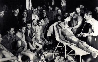 Le fotografie che la Bourke-White scatta a Buchenwald non sono una catalogazione di aneddoti, ma una forma spezzata di punteggiatura fotografica col passato… sono elementari… dirette, quasi anonime… hanno un’aura d’essenzialità che si compromette con il fotografato… se prendiamo l’immagine in cui il corpo consunto di un deportato è steso su un lettino bianco… curato da medici militari, attorniato da “figuranti” dell’Olocausto… ed è evidentemente una “fotografia costruita”… vediamo che l’immagine è stata presa sul ricordo dei dipinti delle lezioni mediche nelle università dell’’800… c’è la condivisione del corpo ferito con ciò che lo circonda ed elementi di salvezza dovuti all’accuratezza dei salvatori… qui il “falso” funziona perché non c’è nulla di sacro!… l’inquadratura porta il lettore al centro del dolore… non c’è malafede, ma sdegno contro l’ingiustizia che ha provocato quel dolore! Il corpo denutrito dell’uomo (al quale hanno posto un panno bianco sui genitali) è un atto di accusa contro i carnefici e mostra le ferite della carne che disvelano la barbarie nazista!
