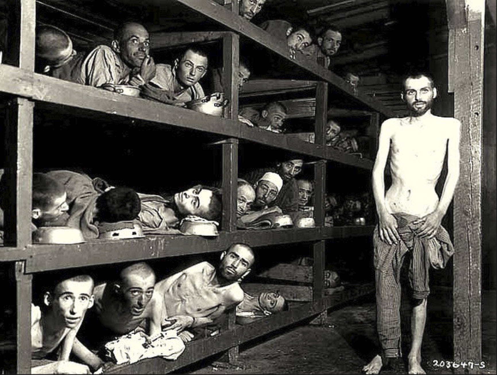 L’anatomia accurata di una sola immagine dei campi della Bourke-White, ci fa “scoprire” spettatori o complici di un’inciviltà al passo dell’oca… si tratta della fotografia presa all’interno di una baracca di Buchenwald (1945)… in piedi, sulla destra dell’inquadratura, si vede un uomo dal corpo sfinito, seminudo (si copre i genitali), impietrito in una pelle da santo imbiancato dal flash (forse), che getta la timidezza e l’imbarazzo verso un angolo della porta (o del cielo)… a sinistra una carrellata di volti e corpi emaciati dalla fame, attaccati a scodelle di alluminio, si allunga nei letti di legno che sembrano una sfilata di feriti imbalsamati nel terrore… lo sguardo austero della Bourke-White li coglie nella profondità del vero… nell’autenticità di una visione compassionevole che attraverso la fotografia incrimina tutti gli adulatori delle persecuzioni, compreso i silenti e gli inservienti degli imperativi! I carnefici si vedono sui loro volti… senza remissione dei peccati! Il mostruoso è tutto ciò che ispira ammirazione e soggezione… una fascinazione che intruglia malvagità e paura… il capo ordina! l’idiota esegue! La verità non si rivela che agli eretici, a coloro che non firmeranno mai un trattato di pace o di vittoria con il crimine costituito!