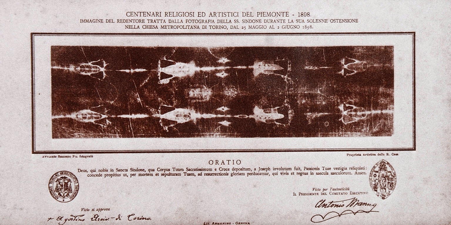 Sull’iconologia della Sacra Sindone. Per il 400esimo anniversario della cattedrale di Torino, insieme al 50esimo anniversario dello Statuto Albertino (promulgato da re Carlo Alberto di Savoia — “legge fondamentale perpetua ed irrevocabile della Monarchia sabauda, 1848 —”)… venne decisa un’esposizione di arte sacra (il barone Antonio Manno, un militare di carriera, fu messo a capo dell’impresa). Secondo Pia venne incaricato di fare la fotografia… sotto l’attenta protezione di padre Sanno Salaro e il capo della sicurezza del Duomo, tenente Felice Fino. Il quotidiano genovese Il cittadino pubblicò l’immagine, poi fu la volta del Corriere Nazionale e infine l’Osservatore Romano ne decretò la fama: la negativa mostrava l’immagine di un uomo e di un volto che non si vedevano ad occhio nudo! Sorsero contrasti e Pia fu accusato di contraffazioni sulla genesi soprannaturale dell’immagine… nel 1931, il fotografo professionista Giuseppe Enrie fu chiamato a fotografare la Sindone e si giunse alla medesima conclusione di Pia: il volto e il corpo di Cristo erano deposti in quel panno di lino… nel maggio 1998, papa Giovanni Paolo II, disse: « La Sindone è un’immagine dell’amore di Dio come quella del peccato umano» e chiamò la Sindone «un’icona della sofferenza dell’innocente in ogni era ». Il dibattito internazionale sulla scoperta del Messia resuscitato nella sua interezza plastica, continua con l’ausilio di nuove tecnologie (esame del carbonio 14)… la superbia dell’icona ha finito con il sostituirsi alla faccia (o viceversa)… alla visione della Sacra Sindone c’è chi piange, chi ride, chi vomita, anche incidentalmente! il vizio spirituale è preda d’ogni orgoglio e un’illusione inesauribile diventa sacra!